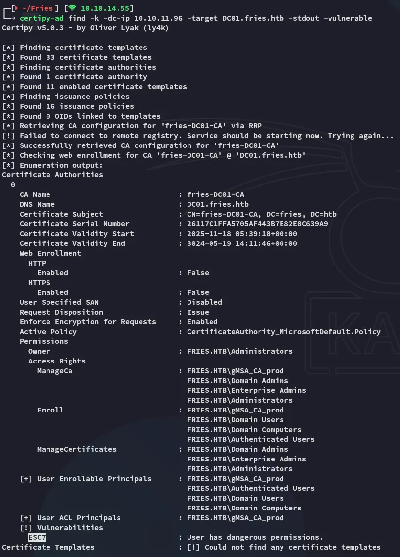 certipy-ad find -k -dc-ip 10.10.11.96 -target DC01.fries.htb -stdout -vulnerable