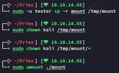 sudo -u tester cp -r mount /tmp/mountsudo chown kali /tmp/mountsudo chown kali /tmp/mount/*sudo umount ./mount