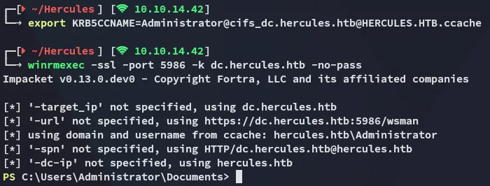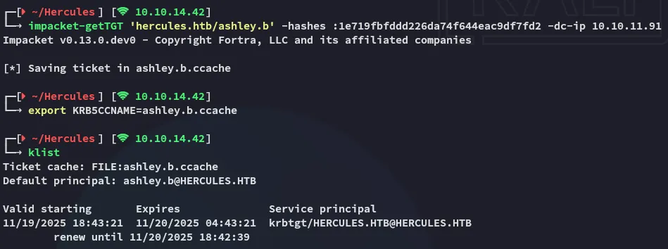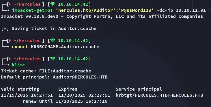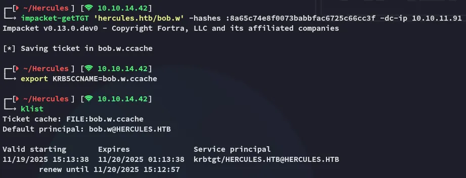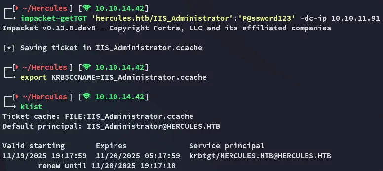 impacket-getTGT 'hercules.htb/IIS_Administrator':'P@ssword123' -dc-ip 10.10.11.91