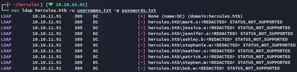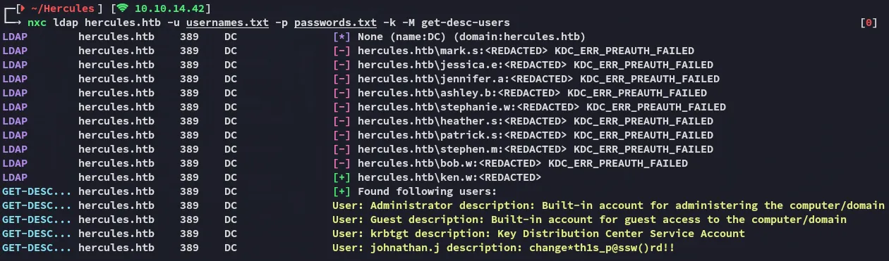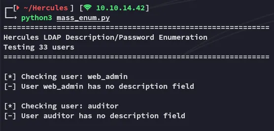 def main(): print("="*60) print("Hercules LDAP Description/Password Enumeration") print(f"Testing {len(KNOWN_USERS)} users") print("="*60)