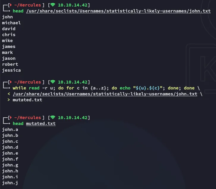 while read -r u; do for c in {a..z}; do echo "${u}.${c}"; done; done < /usr/share/seclists/Usernames/statistically-likely-usernames/john.txt > mutated.txt