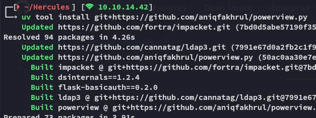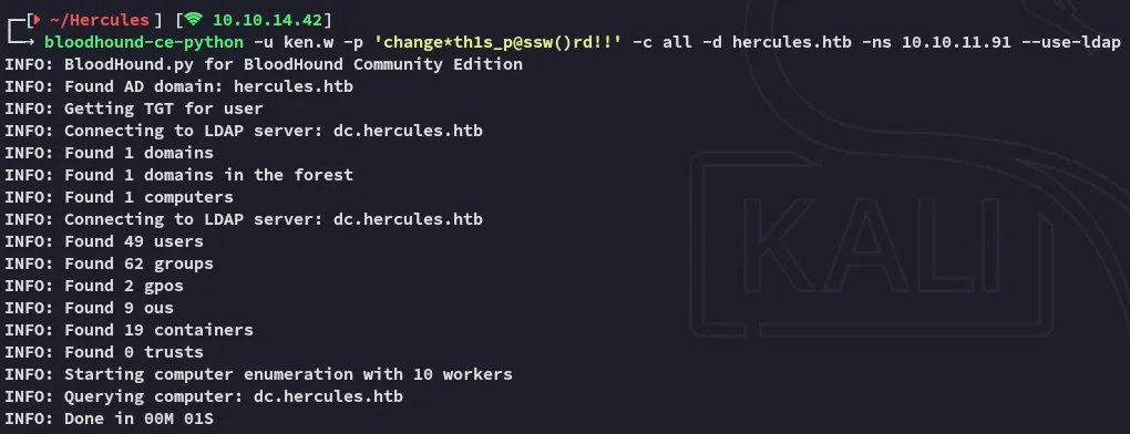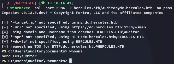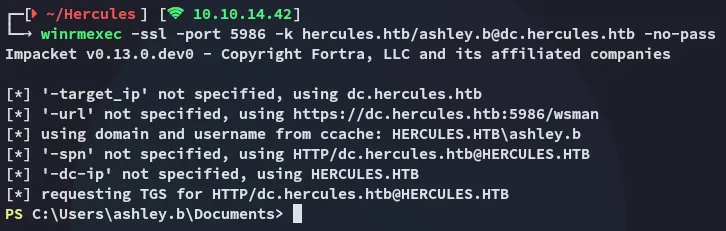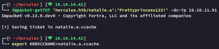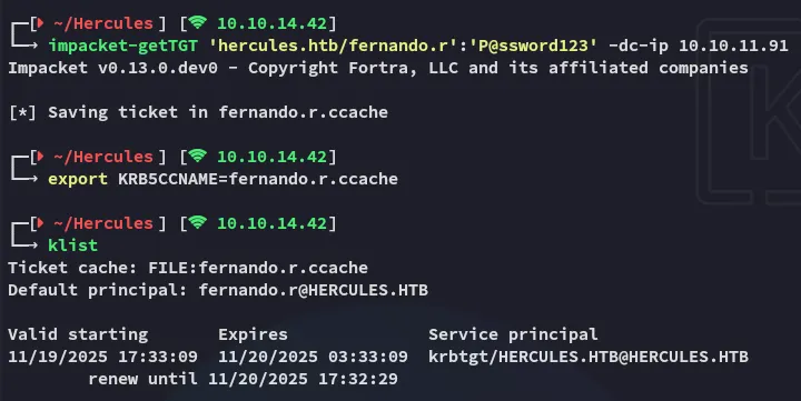 impacket-getTGT 'hercules.htb/fernando.r':'P@ssword123' -dc-ip 10.10.11.91
