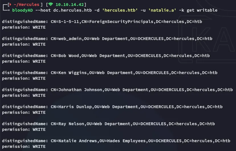 bloodyAD --host dc.hercules.htb -d 'hercules.htb' -u 'natalie.a' -k get writable