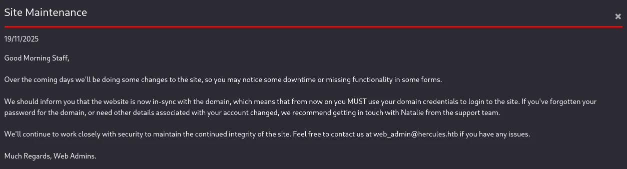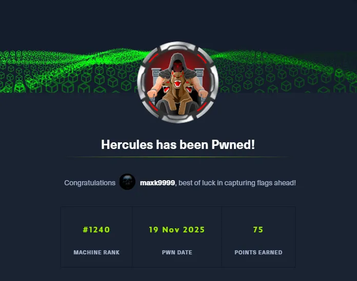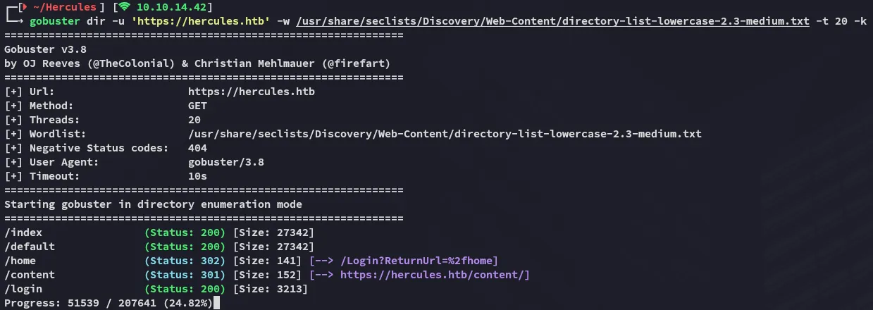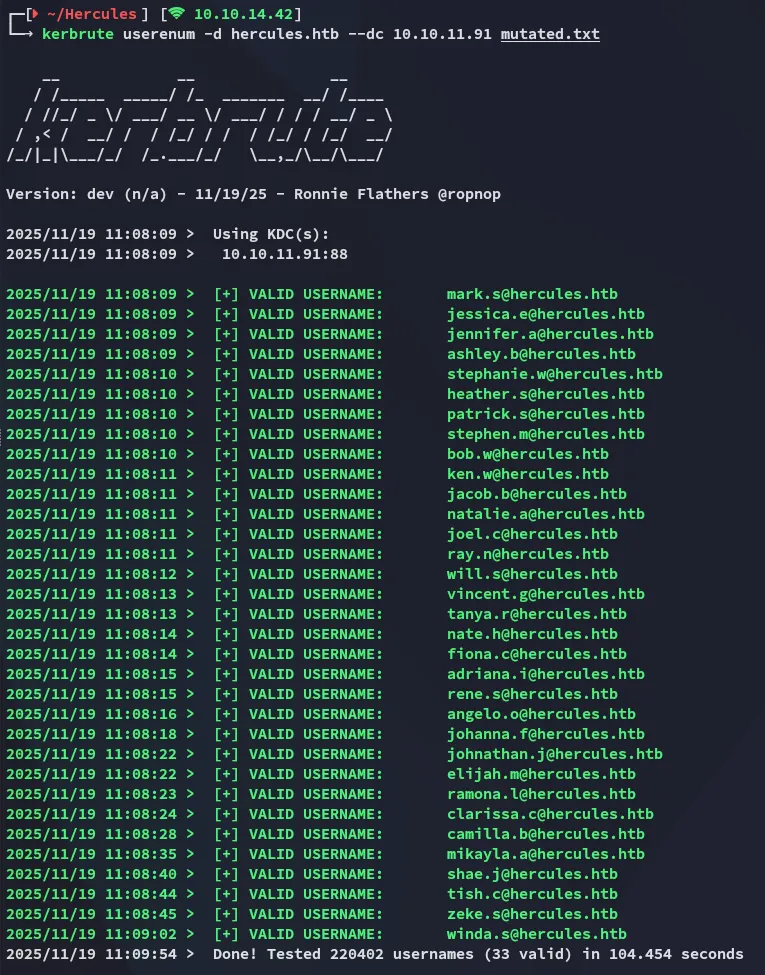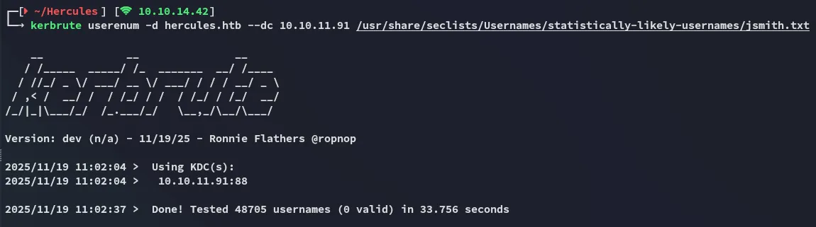 PORT STATE SERVICE REASON VERSION53/tcp open domain syn-ack Simple DNS Plus80/tcp open http syn-ack Microsoft IIS httpd 10.0| http-methods:|_ Supported Methods: GET HEAD POST OPTIONS|_http-server-header: Microsoft-IIS/10.0|_http-title: Did not follow redirect to https://hercules.htb/88/tcp open kerberos-sec syn-ack Microsoft Windows Kerberos (server time: 2025-11-19 09:55:05Z)135/tcp open msrpc syn-ack Microsoft Windows RPC139/tcp open netbios-ssn syn-ack Microsoft Windows netbios-ssn389/tcp open ldap syn-ack Microsoft Windows Active Directory LDAP (Domain: hercules.htb0., Site: Default-First-Site-Name)|_ssl-date: TLS randomness does not represent time| ssl-cert: Subject: commonName=dc.hercules.htb| Subject Alternative Name: DNS:dc.hercules.htb, DNS:hercules.htb, DNS:HERCULES| Issuer: commonName=CA-HERCULES/domainComponent=hercules443/tcp open ssl/http syn-ack Microsoft IIS httpd 10.0| tls-alpn:|_ http/1.1|_http-title: Hercules Corp| ssl-cert: Subject: commonName=hercules.htb| Subject Alternative Name: DNS:hercules.htb| Issuer: commonName=hercules.htb445/tcp open microsoft-ds? syn-ack464/tcp open kpasswd5? syn-ack593/tcp open ncacn_http syn-ack Microsoft Windows RPC over HTTP 1.0636/tcp open ssl/ldap syn-ack Microsoft Windows Active Directory LDAP (Domain: hercules.htb0., Site: Default-First-Site-Name)3268/tcp open ldap syn-ack Microsoft Windows Active Directory LDAP (Domain: hercules.htb0., Site: Default-First-Site-Name)3269/tcp open ssl/ldap syn-ack Microsoft Windows Active Directory LDAP (Domain: hercules.htb0., Site: Default-First-Site-Name)5986/tcp open ssl/http syn-ack Microsoft HTTPAPI httpd 2.0 (SSDP/UPnP)|_http-server-header: Microsoft-HTTPAPI/2.0| ssl-cert: Subject: commonName=dc.hercules.htb| Subject Alternative Name: DNS:dc.hercules.htb, DNS:hercules.htb, DNS:HERCULES| Issuer: commonName=CA-HERCULES/domainComponent=hercules9389/tcp open mc-nmf syn-ack .NET Message Framing49664/tcp open msrpc syn-ack Microsoft Windows RPC49668/tcp open msrpc syn-ack Microsoft Windows RPC49674/tcp open ncacn_http syn-ack Microsoft Windows RPC over HTTP 1.049684/tcp open msrpc syn-ack Microsoft Windows RPC50731/tcp open msrpc syn-ack Microsoft Windows RPC50737/tcp open msrpc syn-ack Microsoft Windows RPCService Info: Host: DC; OS: Windows; CPE: cpe:/o:microsoft:windows