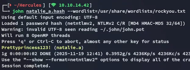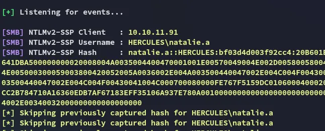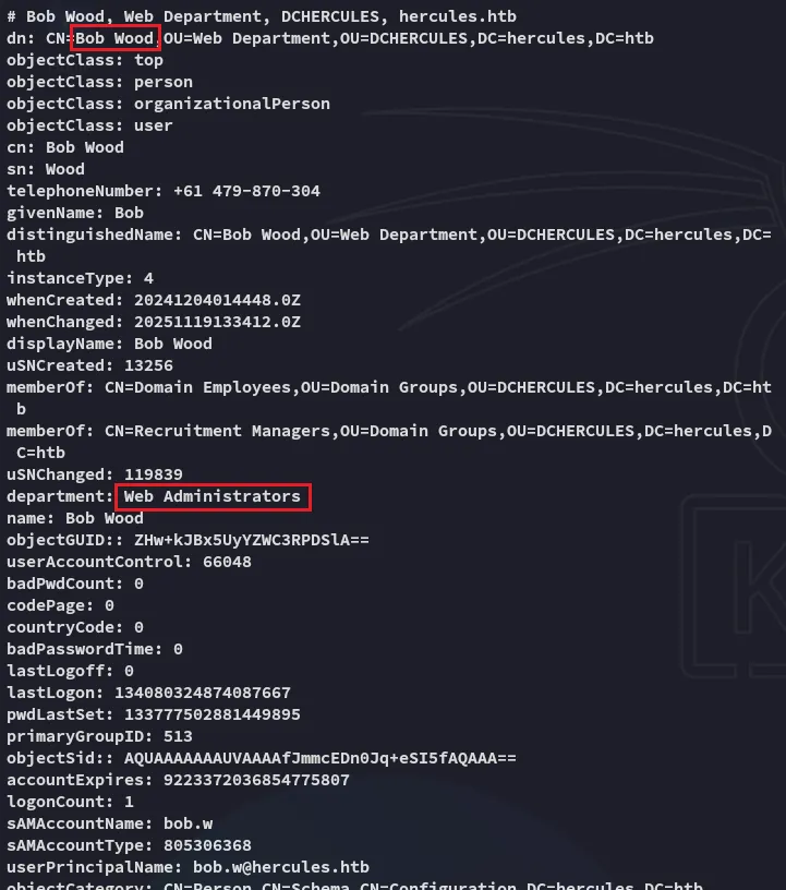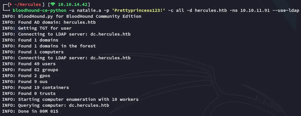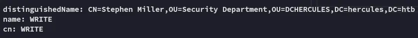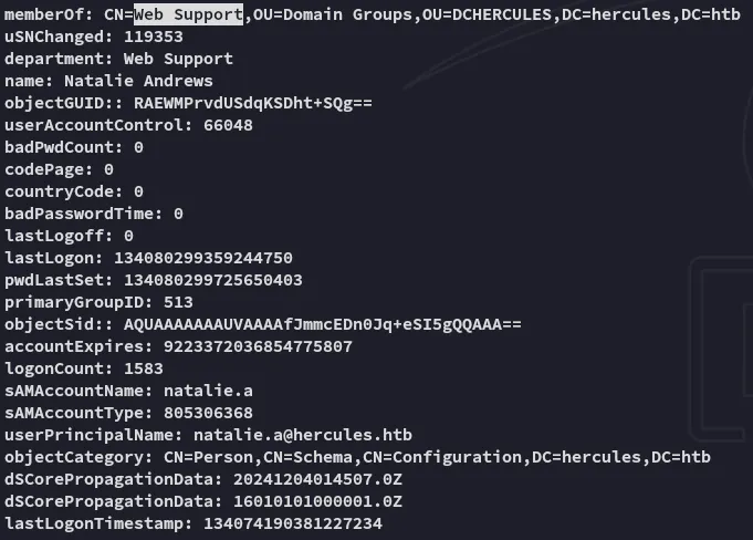 ldapsearch -x -H ldap://10.10.11.91 -D "natalie.a@hercules.htb" -w 'Prettyprincess123!' -b "DC=hercules,DC=htb" "(sAMAccountName=natalie.a)"