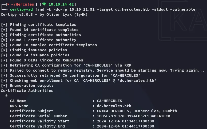 certipy-ad find -k -dc-ip 10.10.11.91 -target dc.hercules.htb -stdout -vulnerable