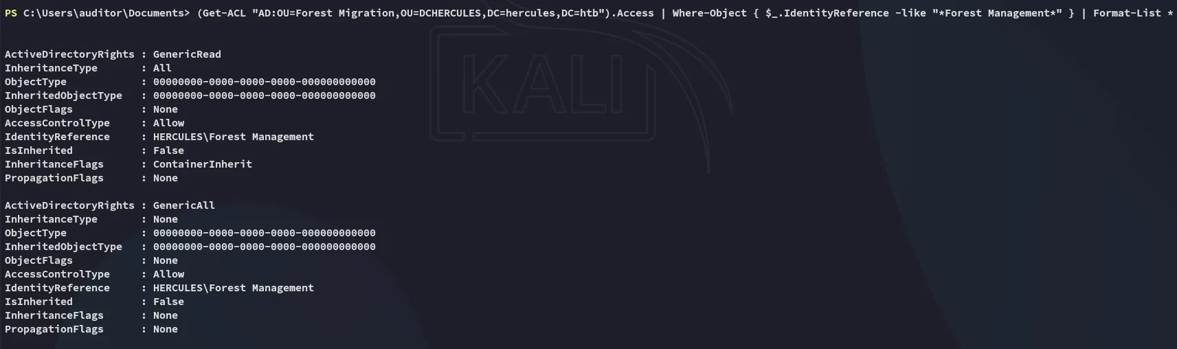 (Get-ACL "AD:OU=Forest Migration,OU=DCHERCULES,DC=hercules,DC=htb").Access | Where-Object { $_.IdentityReference -like "*Forest Management*" } | Format-List *