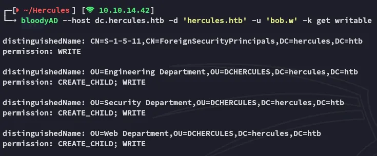 bloodyAD --host dc.hercules.htb -d 'hercules.htb' -u 'bob.w' -k get writable