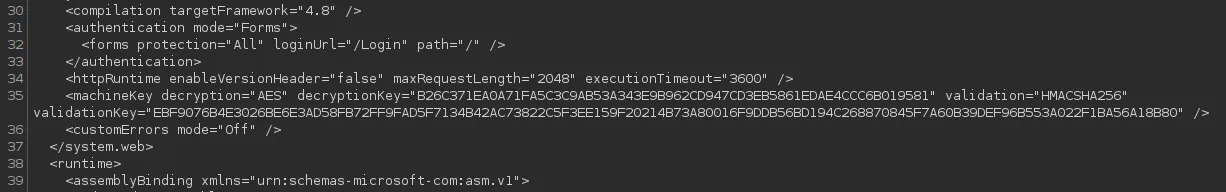 decryption="AES"decryptionKey="B26C371EA0A71FA5C3C9AB53A343E9B962CD947CD3EB5861EDAE4CCC6B019581"validation="HMACSHA256"validationKey="EBF9076B4E3026BE6E3AD58FB72FF9FAD5F7134B42AC73822C5F3EE159F20214B73A80016F9DDB56BD194C268870845F7A60B39DEF96B553A022F1BA56A18B80"Dotnet