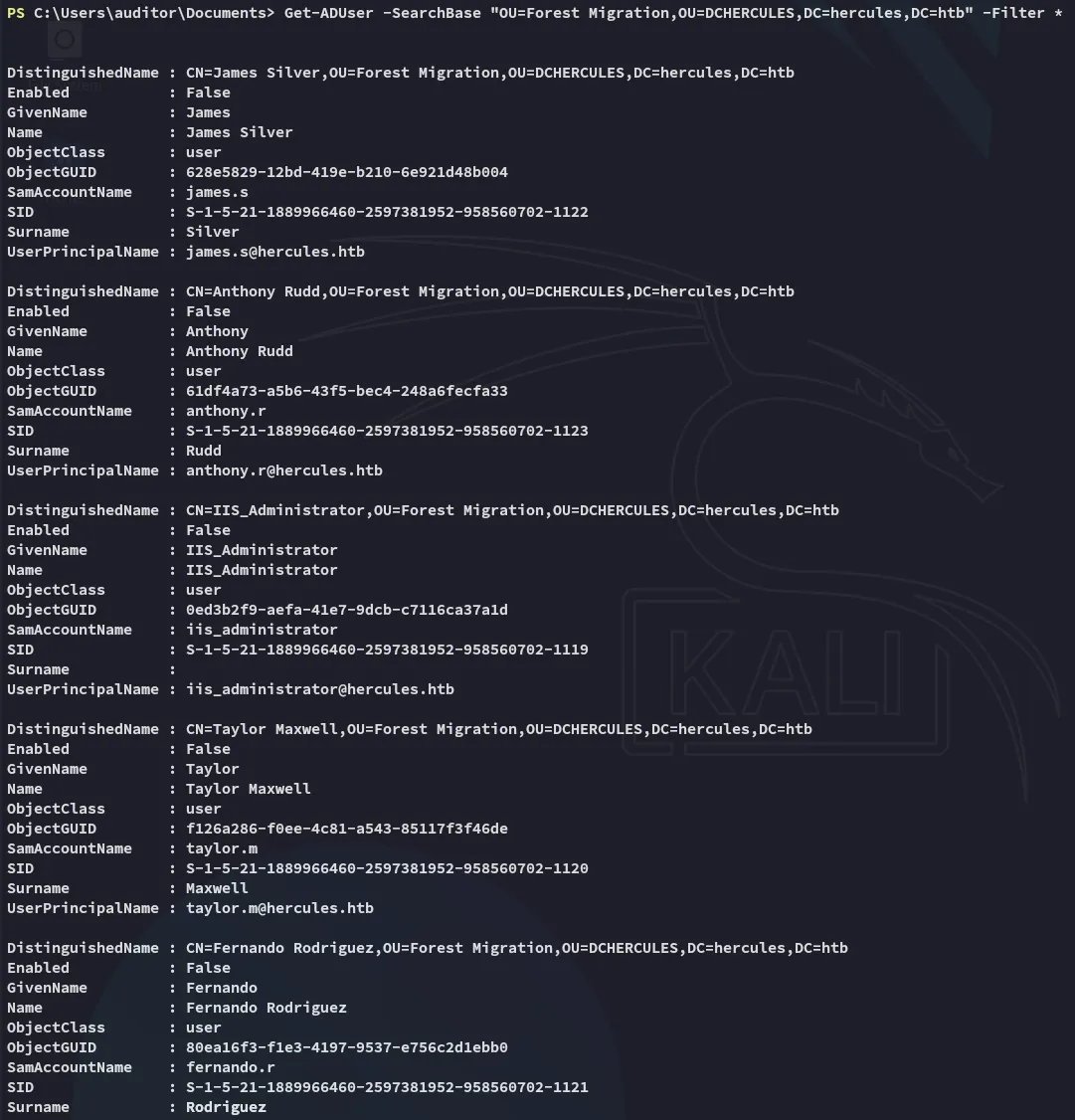 Get-ADUser -SearchBase "OU=Forest Migration,OU=DCHERCULES,DC=hercules,DC=htb" -Filter *