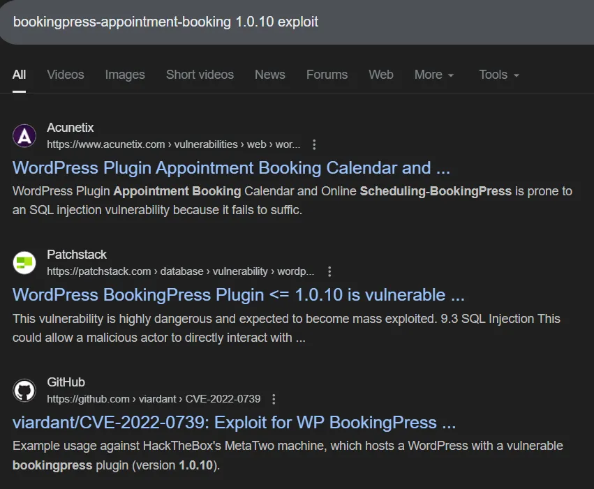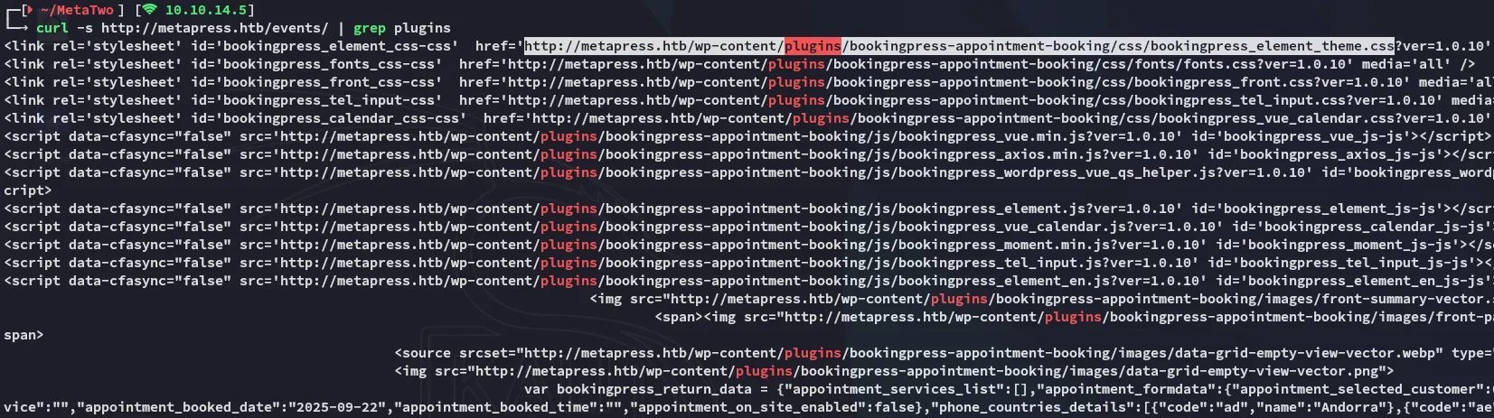 Above I found another plugin that wasn’t found by wpscan on the mainpage, namely bookingpress-appointment-booking.
