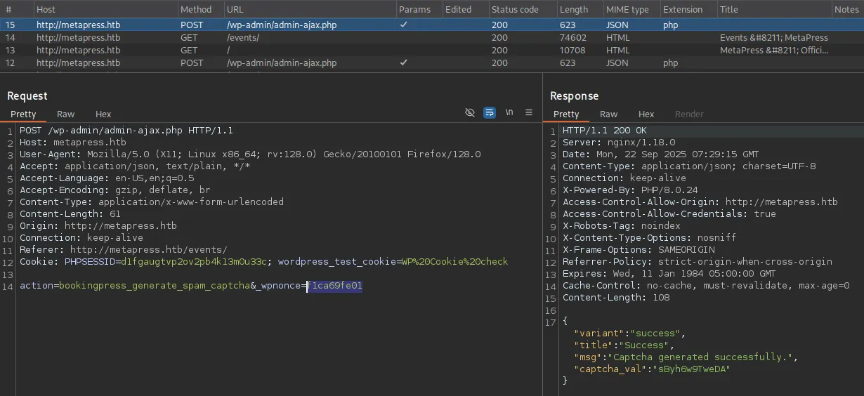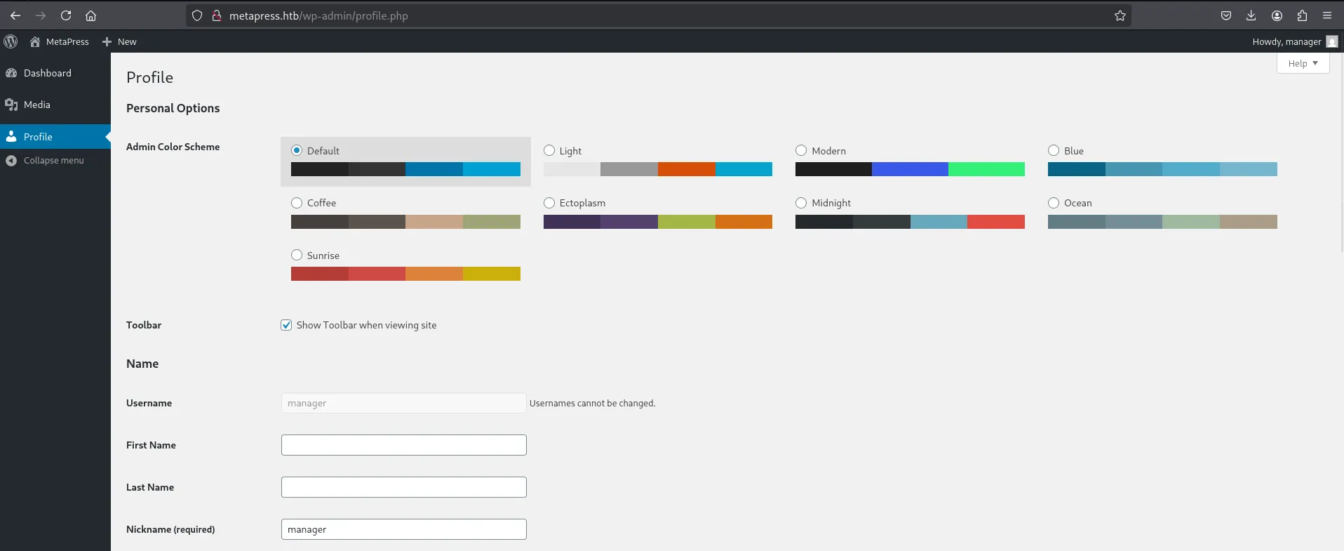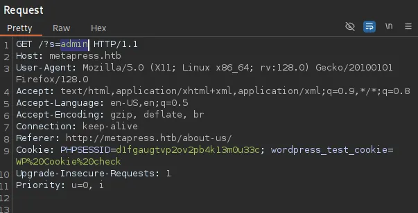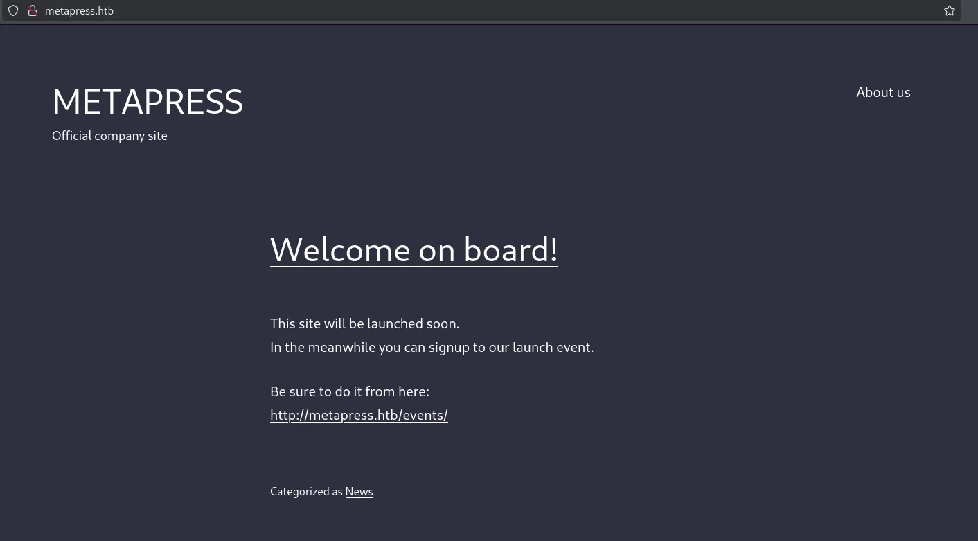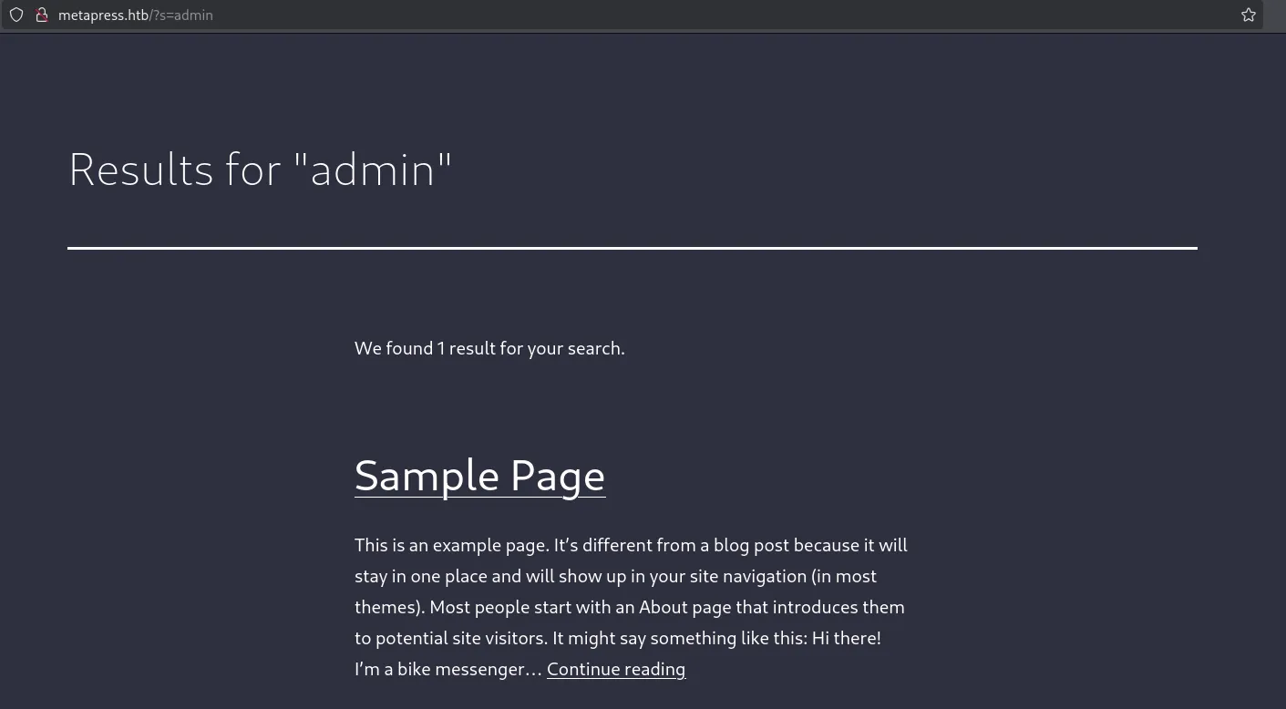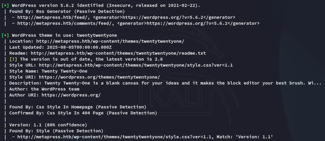PORT STATE SERVICE REASON VERSION21/tcp open ftp? syn-ack| fingerprint-strings:| GenericLines:| 220 ProFTPD Server (Debian) [::ffff:10.10.11.186]| Invalid command: try being more creative|_ Invalid command: try being more creative22/tcp open ssh syn-ack OpenSSH 8.4p1 Debian 5+deb11u1 (protocol 2.0)80/tcp open http syn-ack nginx 1.18.0| http-methods:|_ Supported Methods: GET HEAD POST OPTIONS|_http-server-header: nginx/1.18.0|_http-title: Did not follow redirect to http://metapress.htb/80/TCP - HTTP