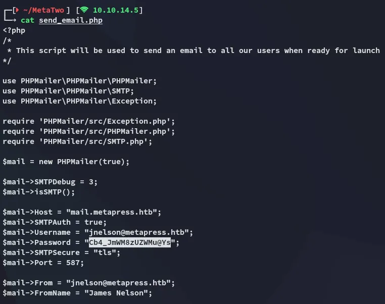 Reading the send_email.php file we find a set of SSH creds for jnelson: