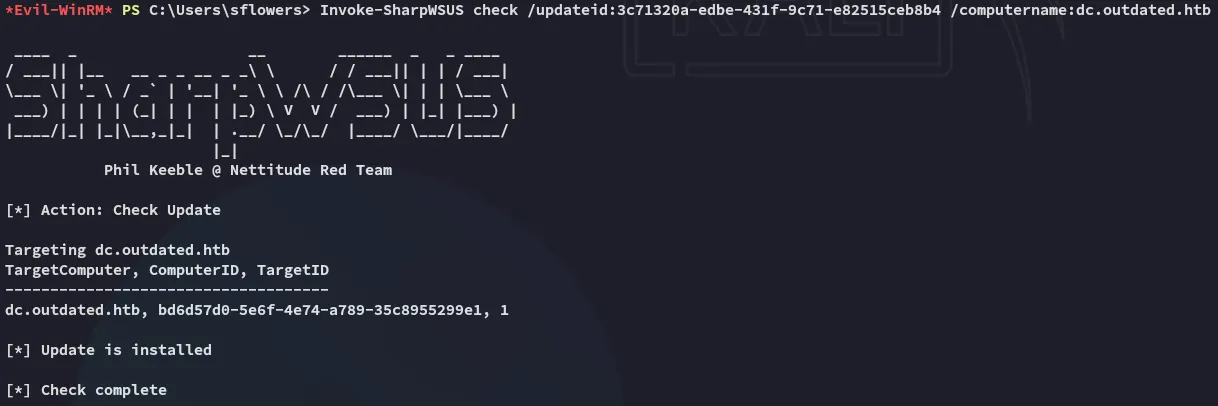 Invoke-SharpWSUS check /updateid:3c71320a-edbe-431f-9c71-e82515ceb8b4 /computername:dc.outdated.htb