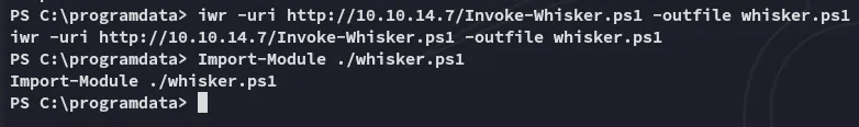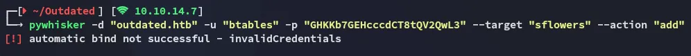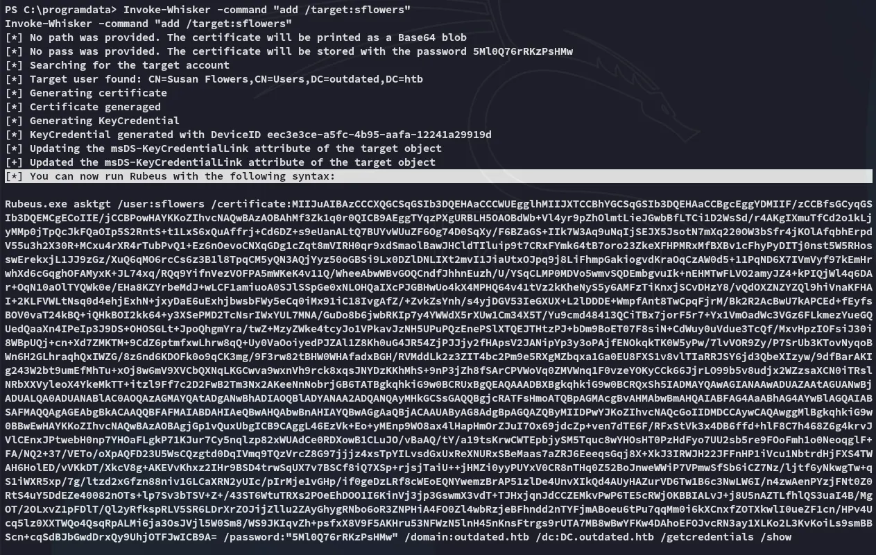 Invoke-Whisker -command "add /target:sflowers"Upon running we see this output: