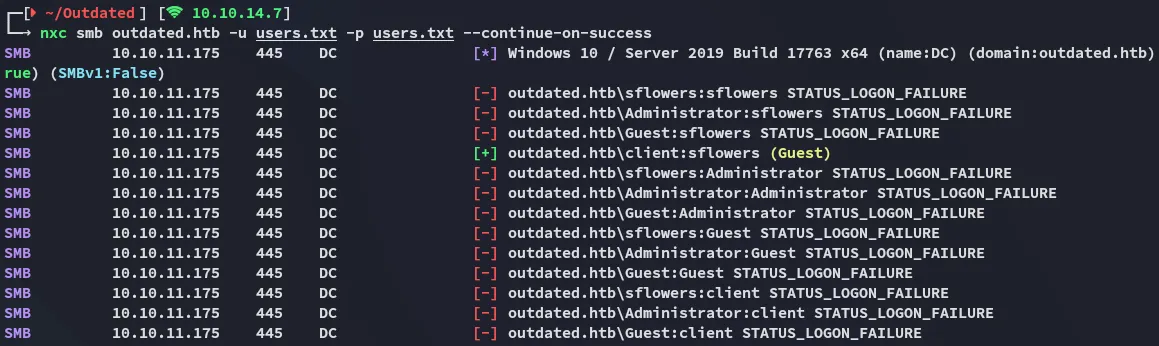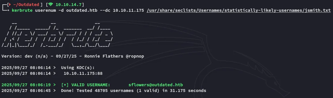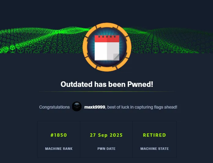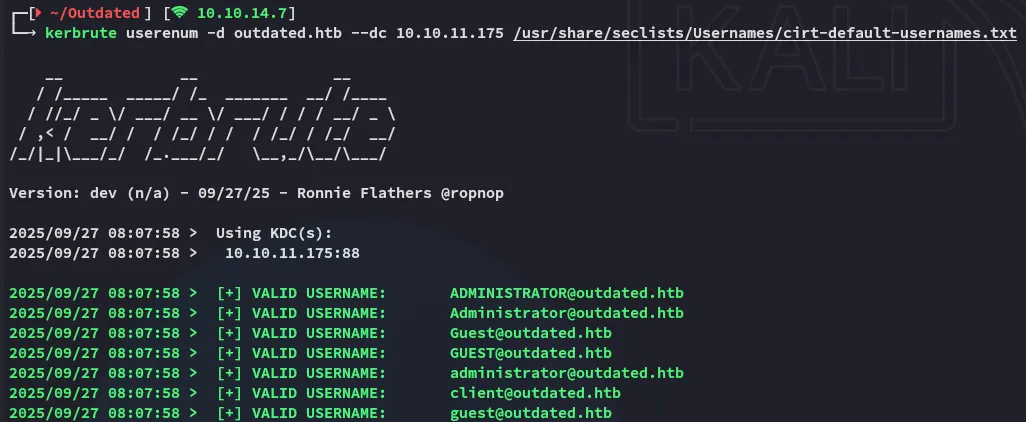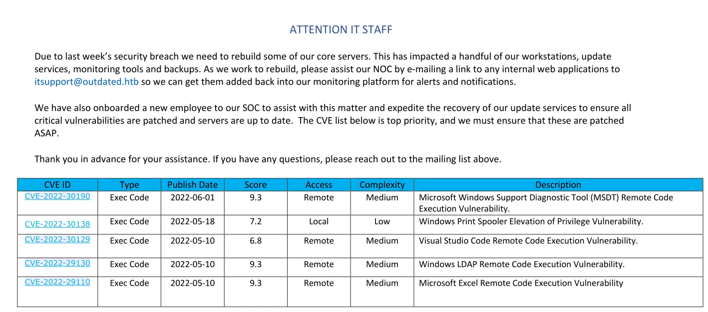 PORT STATE SERVICE REASON VERSION25/tcp open smtp syn-ack hMailServer smtpd| smtp-commands: mail.outdated.htb, SIZE 20480000, AUTH LOGIN, HELP|_ 211 DATA HELO EHLO MAIL NOOP QUIT RCPT RSET SAML TURN VRFY53/tcp open domain syn-ack Simple DNS Plus88/tcp open kerberos-sec syn-ack Microsoft Windows Kerberos (server time: 2025-09-27 14:00:55Z)135/tcp open msrpc syn-ack Microsoft Windows RPC139/tcp open netbios-ssn syn-ack Microsoft Windows netbios-ssn389/tcp open ldap syn-ack Microsoft Windows Active Directory LDAP (Domain: outdated.htb0., Site: Default-First-Site-Name)445/tcp open microsoft-ds? syn-ack464/tcp open kpasswd5? syn-ack593/tcp open ncacn_http syn-ack Microsoft Windows RPC over HTTP 1.0636/tcp open ssl/ldap syn-ack Microsoft Windows Active Directory LDAP (Domain: outdated.htb0., Site: Default-First-Site-Name)3268/tcp open ldap syn-ack Microsoft Windows Active Directory LDAP (Domain: outdated.htb0., Site: Default-First-Site-Name)3269/tcp open ssl/ldap syn-ack Microsoft Windows Active Directory LDAP (Domain: outdated.htb0., Site: Default-First-Site-Name)| ssl-cert: Subject: commonName=DC.outdated.htb| Subject Alternative Name: othername: 1.3.6.1.4.1.311.25.1:<unsupported>, DNS:DC.outdated.htb| Issuer: commonName=outdated-DC-CA/domainComponent=outdated5985/tcp open http syn-ack Microsoft HTTPAPI httpd 2.0 (SSDP/UPnP)|_http-title: Not Found|_http-server-header: Microsoft-HTTPAPI/2.08530/tcp open http syn-ack Microsoft IIS httpd 10.0| http-methods:| Supported Methods: OPTIONS TRACE GET HEAD POST|_ Potentially risky methods: TRACE|_http-title: Site doesnt have a title.|_http-server-header: Microsoft-IIS/10.08531/tcp open unknown syn-ack9389/tcp open mc-nmf syn-ack .NET Message Framing49667/tcp open msrpc syn-ack Microsoft Windows RPC49689/tcp open ncacn_http syn-ack Microsoft Windows RPC over HTTP 1.049690/tcp open msrpc syn-ack Microsoft Windows RPC49901/tcp open msrpc syn-ack Microsoft Windows RPC58694/tcp open msrpc syn-ack Microsoft Windows RPC58712/tcp open msrpc syn-ack Microsoft Windows RPCThere’s a web server open on 8530 and smtp seems to be open as well. Furthermore this seems to be a Domain Controller inside the outdated.htb domain called DC.outdated.htb.