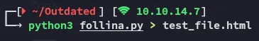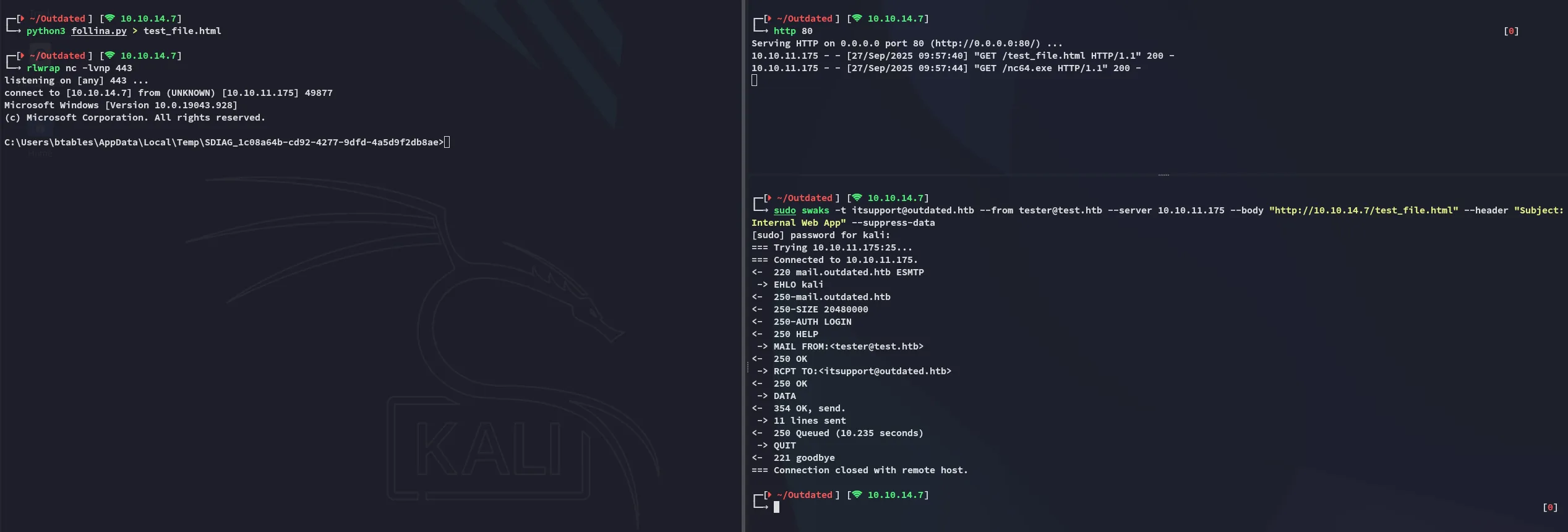 # Swaks commandsudo swaks -t itsupport@outdated.htb --from tester@test.htb --server 10.10.11.175 --body "http://10.10.14.7/test_file.html" --header "Subject:Internal Web App" --suppress-data