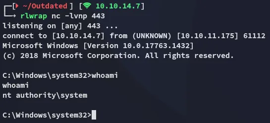 # Listenerrlwrap nc -lvnp 443Upon running and waiting for a short while we get a response: