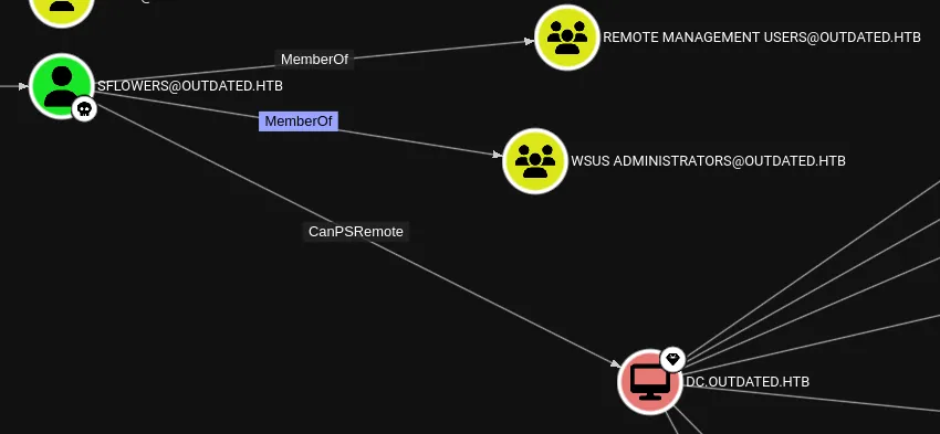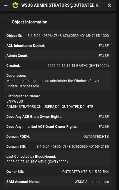 Checking back inside BloodHound we notice that we’re part of the WSUS Administrators group: