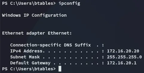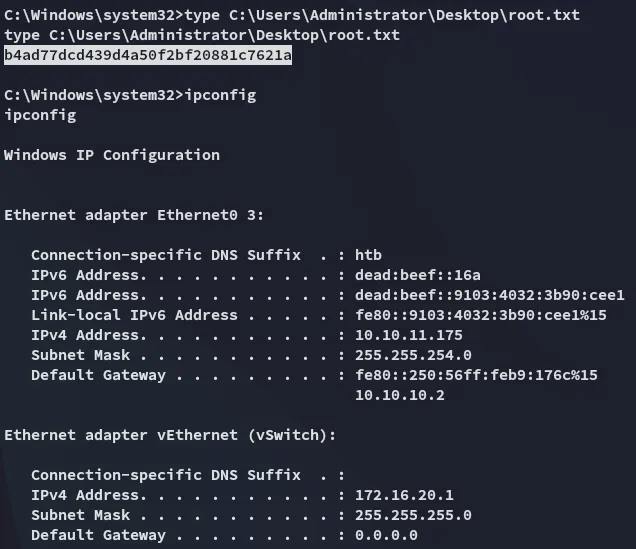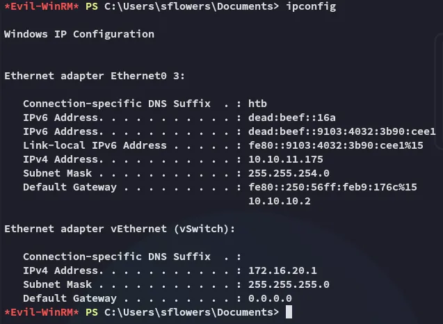 Right away I noticed that I landed inside either the internal network or a HyperV container, and not inside the actual external machine: