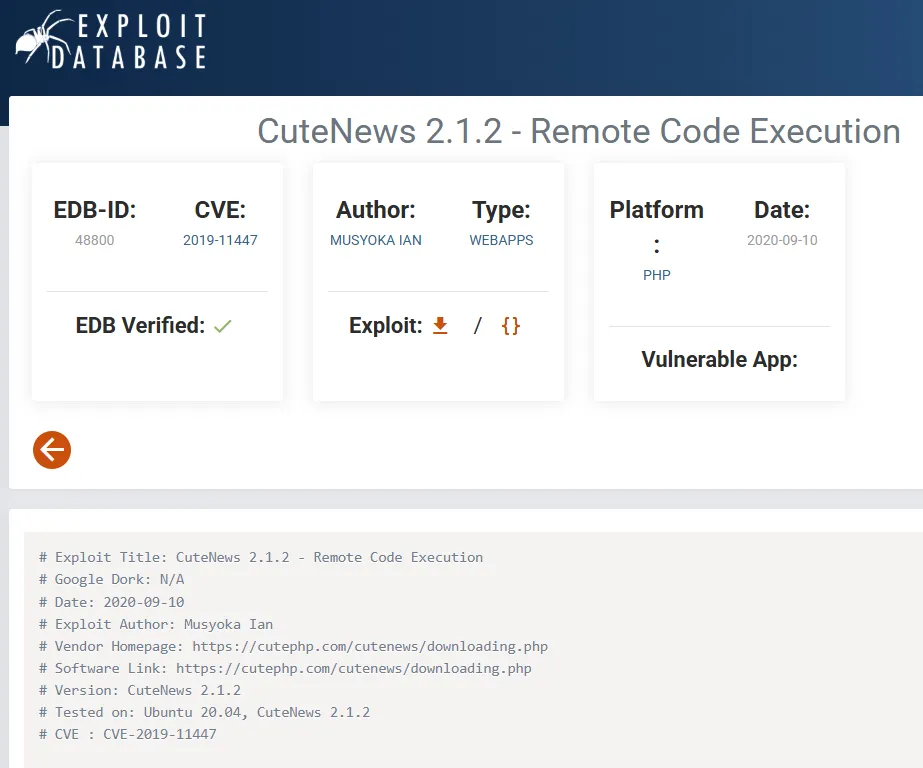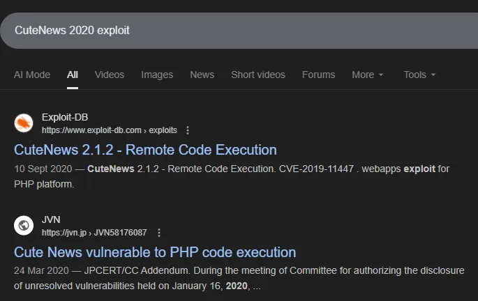 And noticed that the site is powered by CuteNews and the copyright mentions Passage News 2020 so I started checking for exploits: