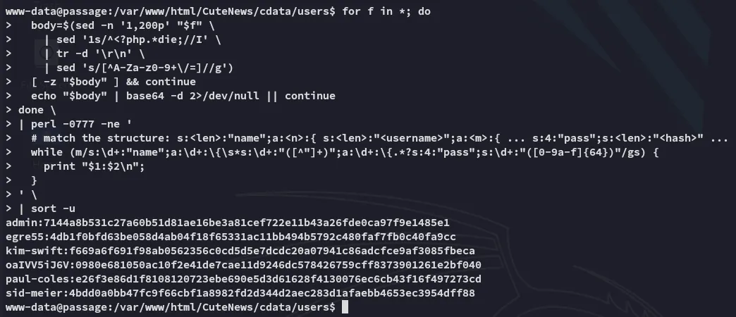 for f in *; do> body=$(sed -n '1,200p' "$f" \> | sed '1s/^<?php.*die;//I' \> | tr -d '\r\n' \> | sed 's/[^A-Za-z0-9+\/=]//g')> [ -z "$body" ] && continue> echo "$body" | base64 -d 2>/dev/null || continue> done \> | perl -0777 -ne '> # match the structure: s:<len>:"name";a:<n>:{ s:<len>:"<username>";a:<m>:{ ... s:4:"pass";s:<len>:"<hash>" ...> while (m/s:\d+:"name";a:\d+:\{\s*s:\d+:"([^"]+)";a:\d+:\{.*?s:4:"pass";s:\d+:"([0-9a-f]{64})"/gs) {> print "$1:$2\n";> }> ' \> | sort -u