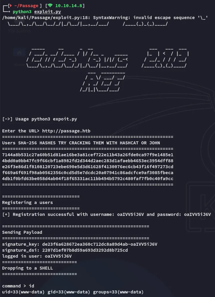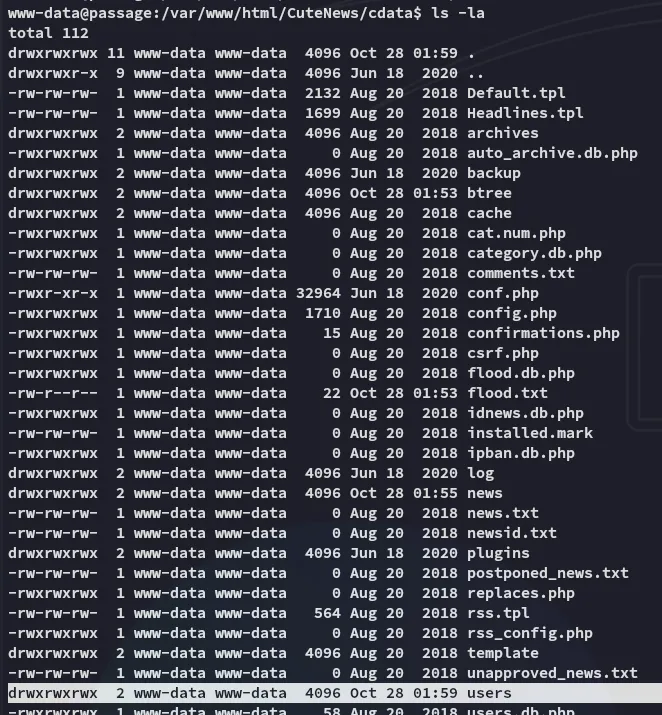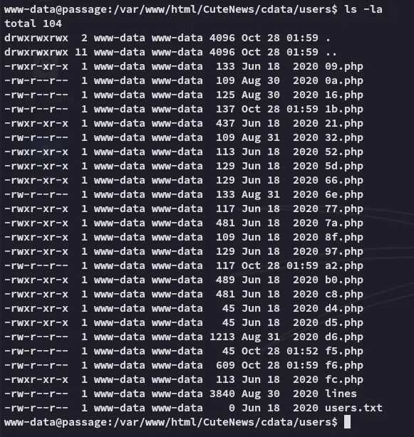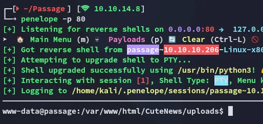 PORT STATE SERVICE REASON VERSION22/tcp open ssh syn-ack OpenSSH 7.2p2 Ubuntu 4 (Ubuntu Linux; protocol 2.0)80/tcp open http syn-ack Apache httpd 2.4.18 ((Ubuntu))|_http-server-header: Apache/2.4.18 (Ubuntu)|_http-title: Passage News| http-methods:|_ Supported Methods: GET HEAD POST OPTIONSService Info: OS: Linux; CPE: cpe:/o:linux:linux_kernel80/TCP - HTTP